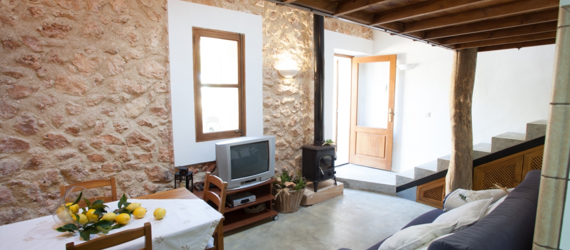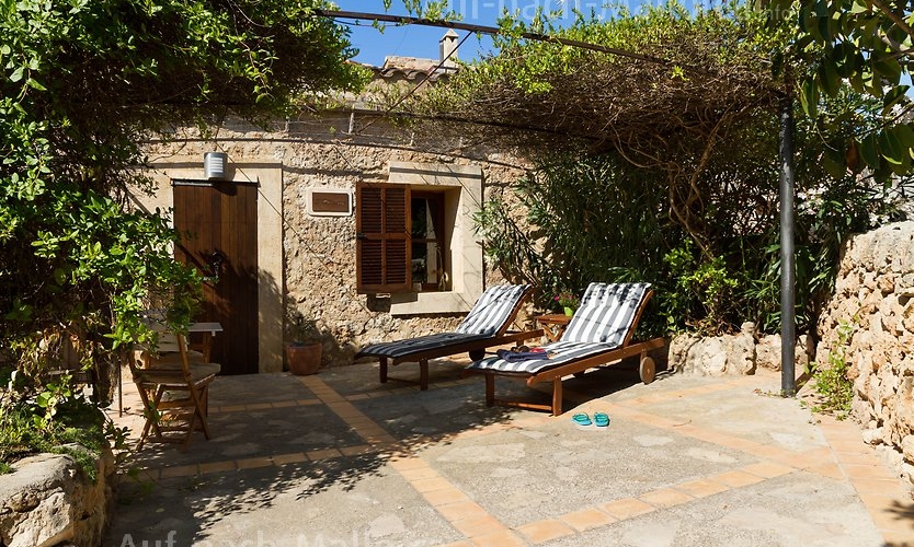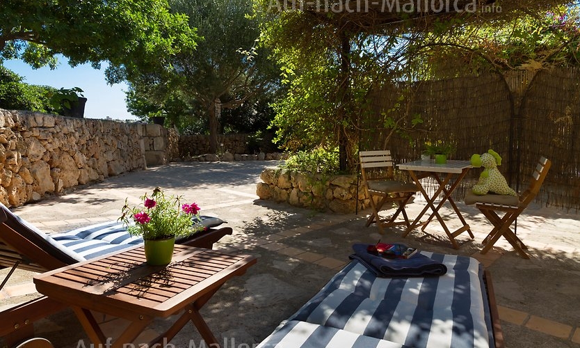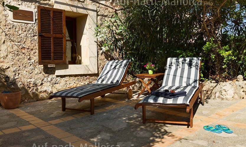 Antiguamente se usaba como “Establo”, donde descansaban los caballos y burros que ayudaban a los payeses en la cosecha de las tierras. La terraza del apartamento en un excelente lugar para echarse una siesta en las cómodas tumbonas. Situado en planta baja y frente a la piscina.