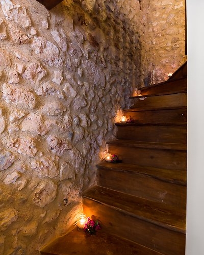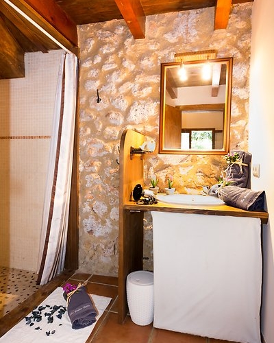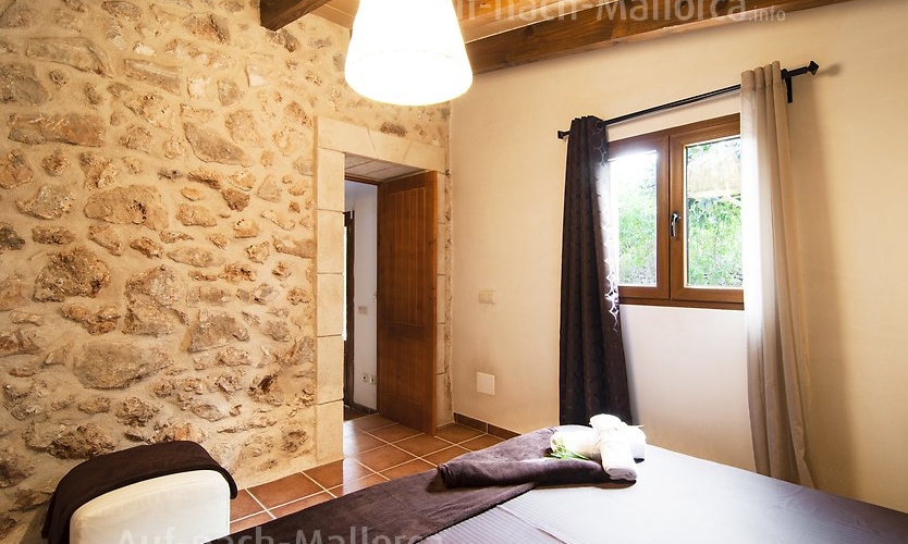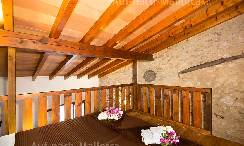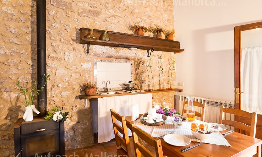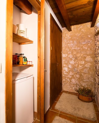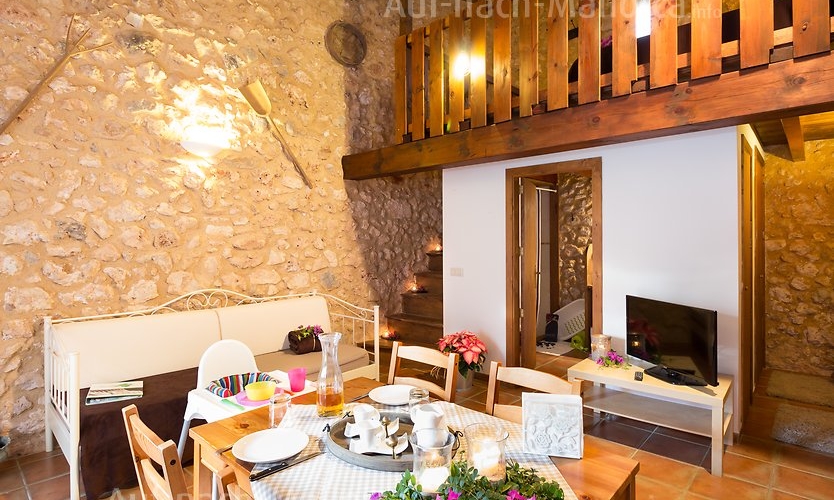 Justo debajo de este apartamento se encuentra un “horno de cal”, donde antiguamente se fabricaba la cal que se utilizaba en la finca. Su decoración interior con vigas de madera y paredes de piedra ofrece un ambiente muy acogedor. Situado en planta baja, justo al lado del comedor y el parque infantil.